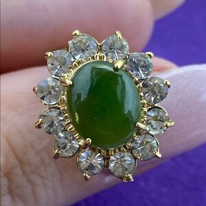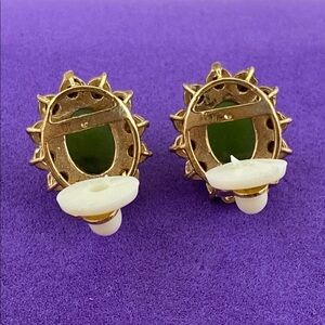 Add a touch of elegance with these stunning green jade and rhinestone gold plated clip on earrings. Perfect for any occasion.