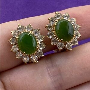 💛 Elegant Vintage Gold Plated Jade & Rhinestone Clip On Earrings