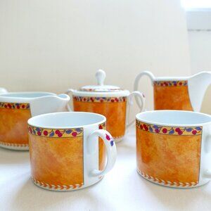 Add a touch of elegance to your tea time with this exquisite tea set from Vista Alegre Portugal. This beautiful set includes two cups, a sugar bowl with lid, and two creamers, all adorned with a vibrant orange and cherry motif. Crafted from fine porcelain, each piece showcases the impeccable craftsmanship and design that Vista Alegre is renowned for.