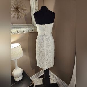 Elegant white lace strapless J. Crew wedding dress. Could also be used for another special occasion. Size 4. Lined. Has built in bra and boning for structure on the top. Beautiful covered buttons on the back. Used but still in excellent condition.