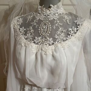 This elegant vintage white wedding dress features intricate lace detailing, perfect for your special day. The flowing design and delicate beaded veil with appliqué flowers add a touch of timeless beauty.