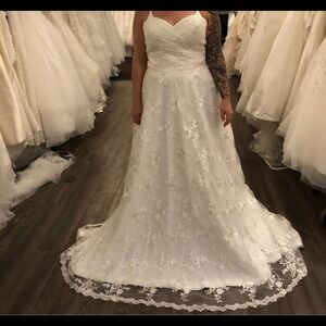 Beautiful white lace wedding dress with intricate floral patterns. Perfect for a special day. Corset back makes the top very versatile in size, never been altered.