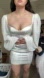 This elegant white satin dress features stylish lantern sleeves, padded cups for extra lift, and a form fitting design. Perfect for special occasions like a birthday or anniversary. Its sleek design offers a sophisticated look.