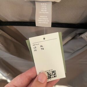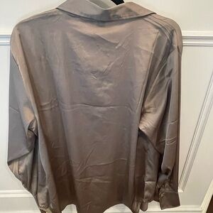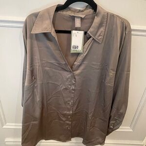 Elevate your wardrobe with this elegant satin blouse. Its sleek design and luxurious feel make it perfect for any occasion. The neutral color adds a touch of sophistication to your outfit.