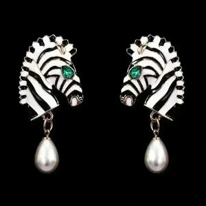 Elegant Zebra Head Stud Pendant Earrings - Green Crystal Eyes, Pearl Drops