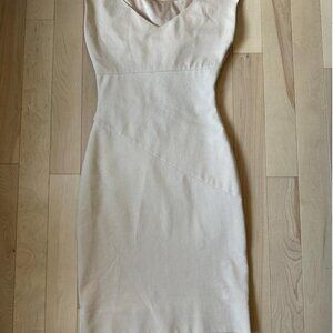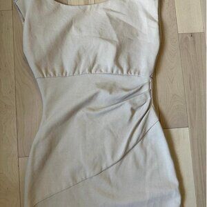 Elegant and timeless Diane von Furstenberg sleeveless bodycon dress in a soft beige tone. Features flattering side ruching and an asymmetrical seam that enhances the silhouette. Perfect for both professional wear and evening occasions.