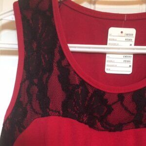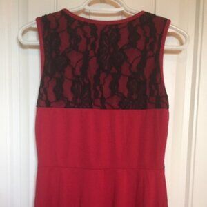 Elegant dress, lace panels in front and back, flared skirt, lined. Stretch fabric. Fabric : Mixed stretch fabric. Color : Burgundy and black. Size M.