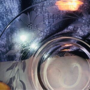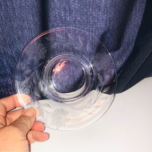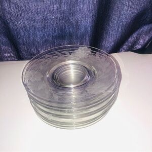 Elegant etched flowers on 6” mid century glass plates- used for desserts, salads