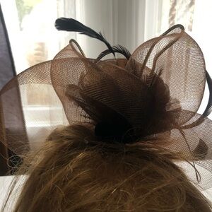 Add a touch of elegance to your outfit with this chic brown fascinator. Perfect for special occasions. There is a place to add a headband but I have found a barrette and pins hold fascinators much easier and the band does not show. Please check pics over.