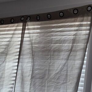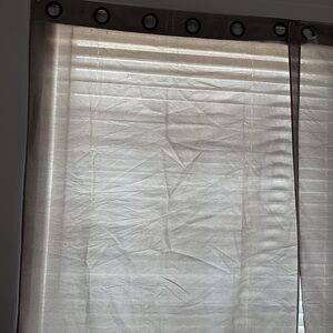 🤎⭐️Enhance your living space with this elegant cream earthy sheer gold tone curtain panel. Designed with a modern minimalist grommet top, it adds a touch of sophistication to any room. Preloved spot stains condition photographed