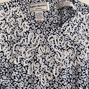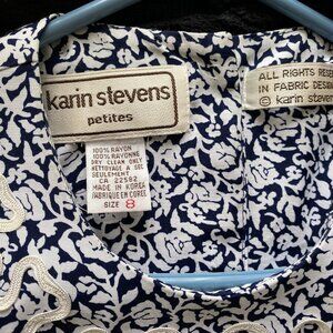 Embrace the timeless charm of the 1980s-1990s with this Karin Stevens dress, tailored for the petite frame in a size 8P. The classic navy and white color scheme exudes a sense of sophistication, perfect for both daytime engagements and special occasions. Crafted from soft 100% Rayon, this original vintage piece offers an elegant look with a comfortable feel. Not see through although not lined. This day dress boasts a stylish design that captures the essence of the era's fashion sensibilities. Its petite size ensures a flattering fit for those with smaller frames, while the brand's reputation for quality guarantees a garment that stands the test of time.