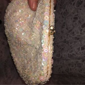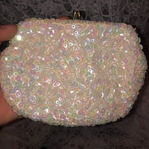 This exquisite clutch showcases a rounded pouch-like shape adorned with a dense layer of iridescent sequins that shimmer beautifully in light. The soft white / cream colour is enhanced by subtle shifts in tone, creating a captivating visual effect. A gold-toned metal frame adds a touch of sophistication to this stunning evening accessory. Made by Du Val in the 1950’s this clutch is in excellent shape. Keep in mind it has being gently used.
