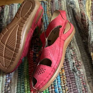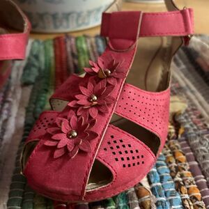 Elevate your look with these elegant pink floral sandals, perfect for any occasion. Fits like a size 8. Like new.