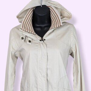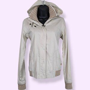 This contemporary jacket by Element is made of a cotton/spandex blend (97/3) and has a great lightweight fit. The jacket has a zipper front and a flap with snaps all the way to the top. There are two front pockets and striped elastic cuffs on the sleeves, around the neck, and at the bottom of the jacket. My favourite part of the jacket is the hood that rolls up and zips into the neck when not in use.