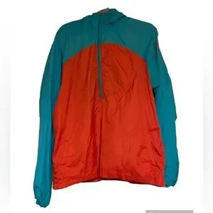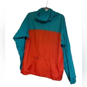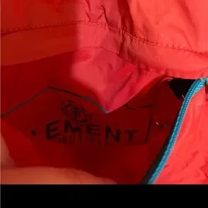 Element Rain Jacket/ pull over size large, in great condition. It is missing the drawstring for the hood and waist but is in other wise great condition. There are 2 pocket on the outside in the front, a zippered pocket in the middle of the back on the outside and a breast pocket with a Velcro close. I believe it is called a half zip.