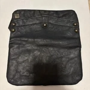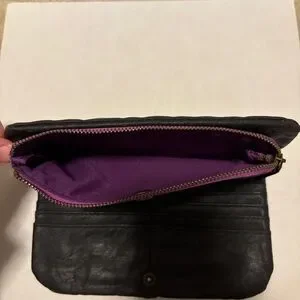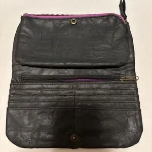 Elegant black leather clutch with a sleek design. Perfect for any occasion. Eight card slots, two bill slots, and two zippered sections.