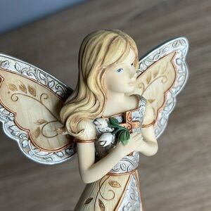Beautiful angel figurine with intricate details including a cross and tulips.