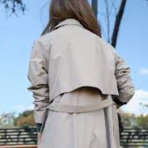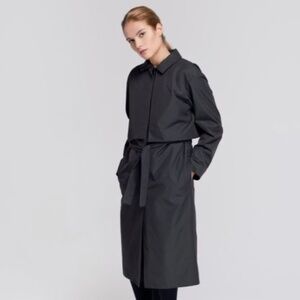 Elegant minimalist coat with slightly dropped shoulders. Button closure with three hidden buttons under the placket. Comes with a tie belt to cinch at the waist, plus symmetrical side pockets.