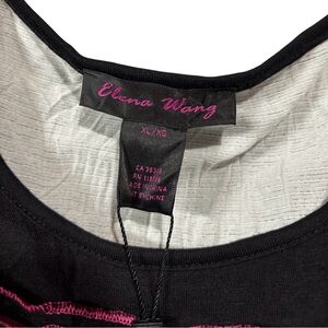 Vibrant sleeveless dress by Elena Wang. Features a mix of black, pink, and purple patterns. Perfect for a bold look.