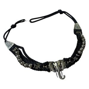Unique statement belt featuring a detailed silver-tone elephant head on thick twisted black cords. Accented with metal beads and ornate engraved end caps. Adjustable with a hook closure.