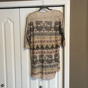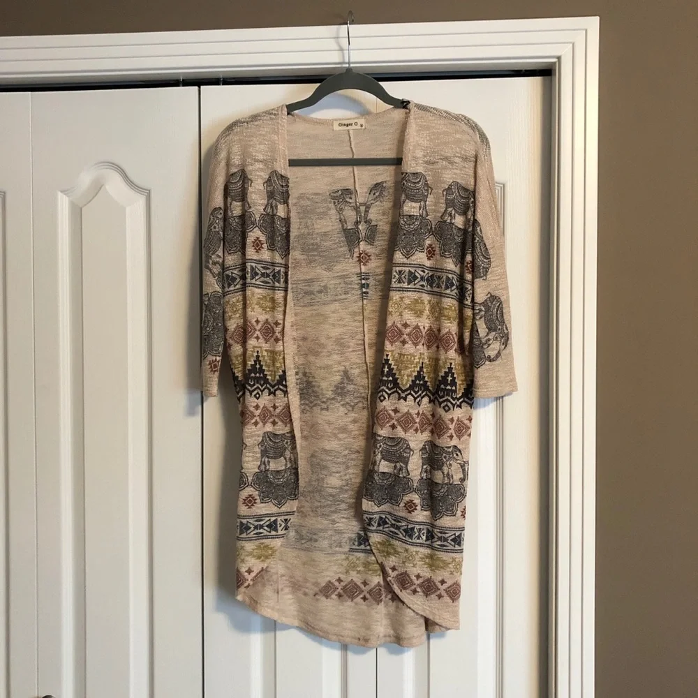 This 3/4 sleeve lightweight elephant pattern cardigan is really soft! The brand is Ginger G. and the size is medium. Worn a handful of times.