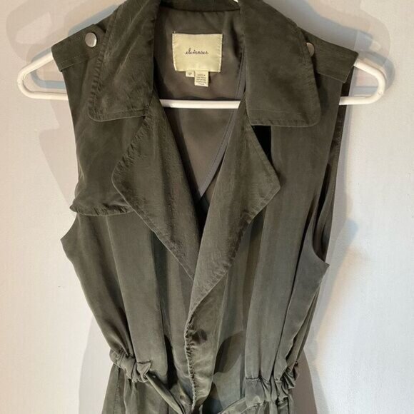 Elevenses tie waist sleeveless wrap trench dress vest. SP. tie closure. Epalauts. Army green olive. Shell 100% cotton, lining 100% poly. Flat lay 18” P-P, 33” L. Made in USA. An Anthropologie brand. #elevenses #anthro #trenchvest #lagenlook