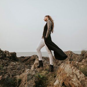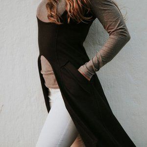 Shaped beautifully with princess seaming, this long vest sweeps and accentuates all your curves from the collar down to the full skirt. The open front lengthens the body visually and provides space for an easy confident stride. Made of soft brushed cotton fleece it pairs with anything in your wardrobe: mini to maxi skirts, shorts to pants, tank tops to long sleeved tops, sandals to boots – you can rock this empowering piece all year long!