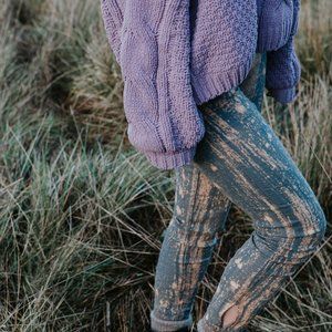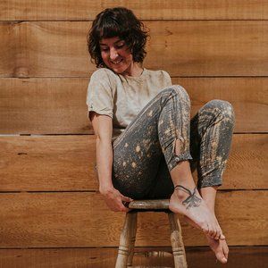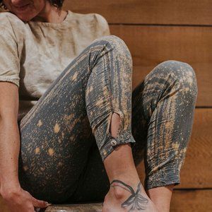 Have you ever stood outside at night marveling at the beauty of the cosmos? If you live in a metropolis the glow of the city lights will compete with the sparkle of space - so we have a wonderful way for you to enjoy midnight skies. The creator and designer of Elfarrow has applied a technique by hand to every pair of these leggings, which makes each one as unique as a section of the infinite universe! A spunky way to brighten up a monochrome look, we recommend wearing these leggings under a dress, tunic or oversized sweater as they tend toward sheerness. They are a 7/8 length, ending above the ankle and have a cute little cutout adorned with a coconut shell button. Step out in these leggings and enjoy the magic of midnight!