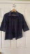 This dark blue peplum blouse pairs beautifully with light colour pants or a skirt. Lovely eyelet detail, hidden button panel and an asymmetric hemline. Fabric tag is missing; material is cotton.