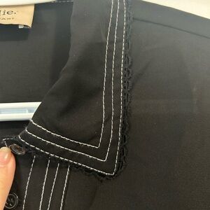 Gorgeous Elie Tahari black button up blouse with white stitching and soft lace detail on collar and cuffs.