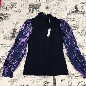 Elie Tahari "Carrie" knit top with sheer, floral-printed, blouson sleeves.