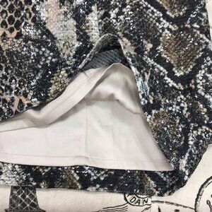 Cap-sleeve mini shift dress in a captivating, shimmering snake-print design.