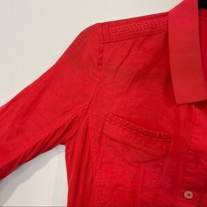 Elie Tahari Women's Orange Cotton/Silk Button Up Top. Blood orange/red/pink. 3/4 sleeve. Chest pockets. rolled cuff. ribbon embellishments on pockets ands shoulder. Western/work/casual wear.