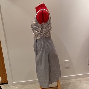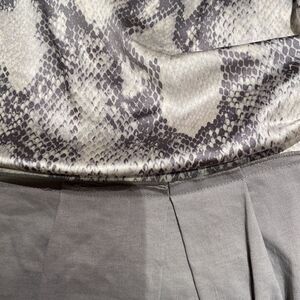 Pretty silk and linen dress . Worn one time. Great for cocktails or lunch on a patio. Soft snakeskin print silk top and thick linen skirt. Does not wrinkle easy. Side zipper for elegant fitting .