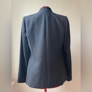 Such a well constructed blazer. It's so slick. It appears to be new. I don't think it was ever worn. Single hook and eye closure. Charcoal in colour. 2 front pockets( still sewn up).