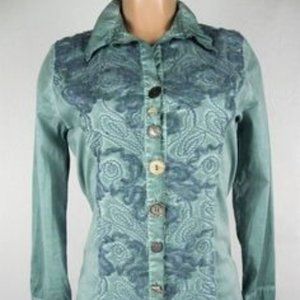 Impeccable condition -has never been worn, size small. Fabric - 96% cotton 4% elastane in tortoise (not blue) colors. It has interesting Tull appliques all around and very exotic buttons. see pictures although it does not give it justice. the size is small although it is roomy.