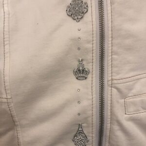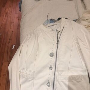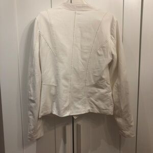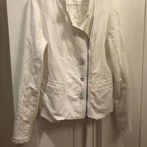 Made in Italy, cotton, asymmetrical zip, metal adorned jacket is lined and wonderfully comfy style. Size medium PTP 18” length 21” and has stretch. Euro chic casual