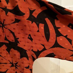 vintage Elite blouse, size 8, black and copper batterned, buttons at rounded collar, pleated front, like new, polyester(?), shimmer