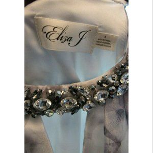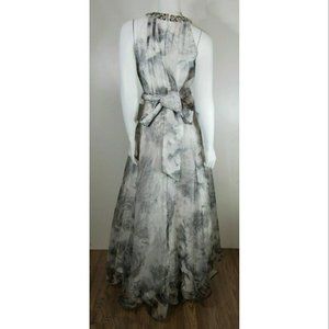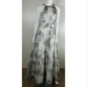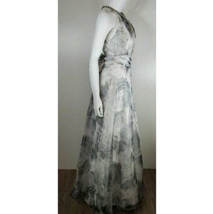 NOTE: There are a few missing beads on the neckline. Size 8 Make it a memorable evening in this romantic, satiny ballgown with a sparkling beaded neckline, moody blooms and flattering pleating. - Hidden back-zip closure - Keyhole halter neck - Sleeveless - Removable tie at waist - Full, floor-length skirt - Lined - Imported Fiber Content 100% polyester Care Dry clean It measures: Length: 57"+ Sleeves: X Bust:18" Waist: 15.5" Hips: 23" Flared C839