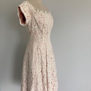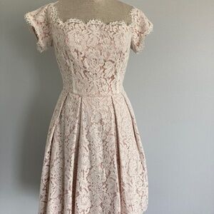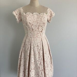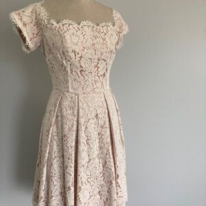Absolutely dreamy dress. Gorgeous quality creamy eyelash lace over a pinky beige satin. Designed to sit just off the shoulder. It is fitted through the bodice and then has a full pleated skirt. The quality is lovely and I've shown the inside of the dress so you can see all the care that has been taken to ensure that the dress cinches in without being too tight. The fabric is beautiful and the lace is a very good quality in a medium weight. It's beautifully made and would be perfect for a prom, wedding or other special event. In very good, clean condition with no flaws, ready to wear.