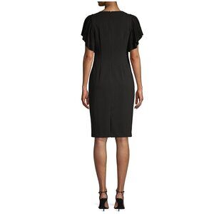 A mix of ruffle and pleated detailing at the sleeves add interest to this sophisticated sheath dress.
