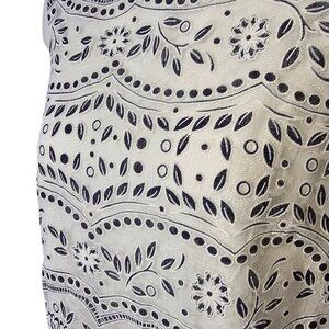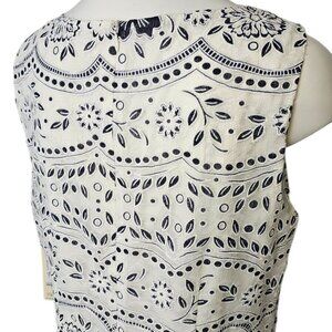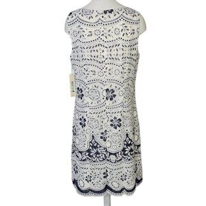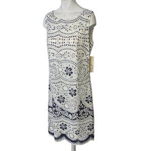 This dress features a sleeveless design with an intricate eyelet pattern, combining floral and geometric motifs for a stylish look. The scalloped hemline adds a touch of elegance, while the lightweight fabric ensures comfort. With a classic white and navy color palette, this piece is perfect for warm-weather outings or casual occasions, blending timeless style with modern details.