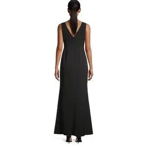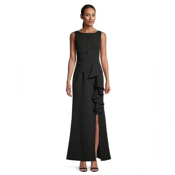 Elegant floor-length gown featuring a cascading ruffle and slit detailing.