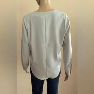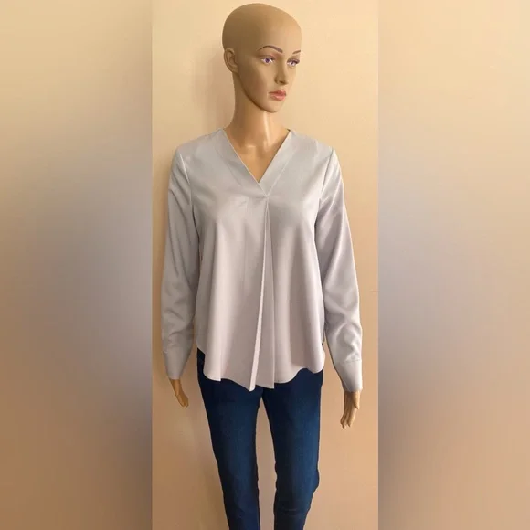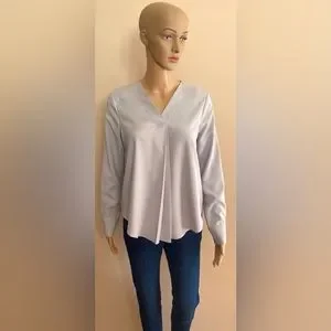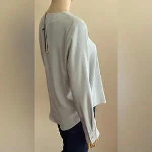 Grey Long Sleeve Top with Button Cuff. Pleat at Top Neck Front. Rounded Hem