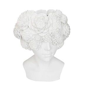 The Elizabeth Flower Head Torso Vase, crafted from resin in a sleek white finish, measures 28.3cm wide, 25.8cm deep, and 38cm high.