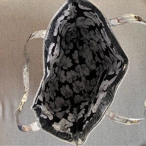 Tote bag with a magnetic snap top closure. Shiny silver metallic look, yet the bag is soft & supple and lightweight. Lined with black & white floral fabric and one inside pocket ( fits cell phone). Top side snaps give bag more top closure options and changes shape of bag. Use of this is optional.