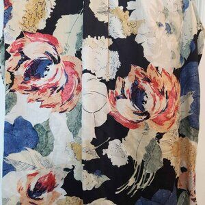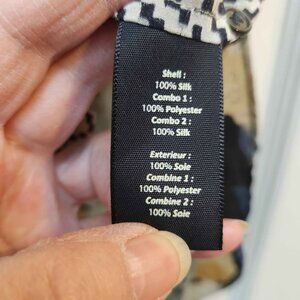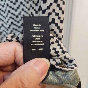 Chic sleeveless blouse with a tie front. Features a black and white zigzag pattern. Floral accents at the hem.