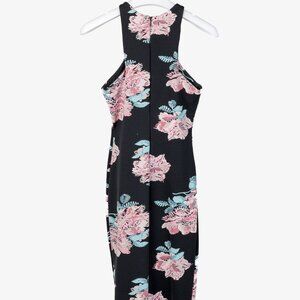 Great for any dressy occasion, the sleeveless Leya bodycon dress from Elizabeth and James is crafted with a Black stretch fabric, and is printed in a large floral of mauve, pink, and teal hues. It features angular cut-in armholes, a crew neck, a front slit, a pencil-cut calf-length midi skirt, and a hidden back zip closure.