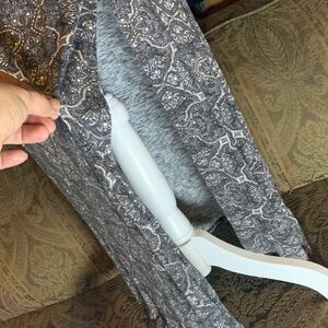 Elegant, soft, slinky, flattering, long sleeve maxi dress with intricate black and gray pattern. V-neckline and floor-length design. Perfect for stylish occasions.