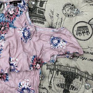 This delicate pink blouse features flutter sleeves and a charming ruffled bib collar, creating a romantic and feminine silhouette. The lightweight fabric enhances its flowy style, making it perfect for warm days or special occasions.